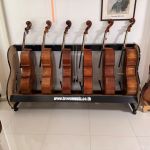 Cello Rack is made of hardwood rails and brushed varnish finished melamine sides. Each unit can hold up to five 4 cellos and features casters and bow holders. |