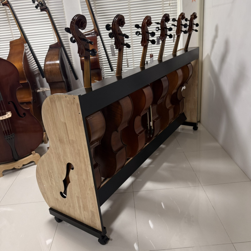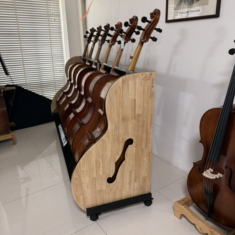 Cello Rack is made of hardwood rails and brushed varnish finished melamine sides. Each unit can hold up to five 4 cellos and features casters and bow holders.